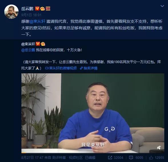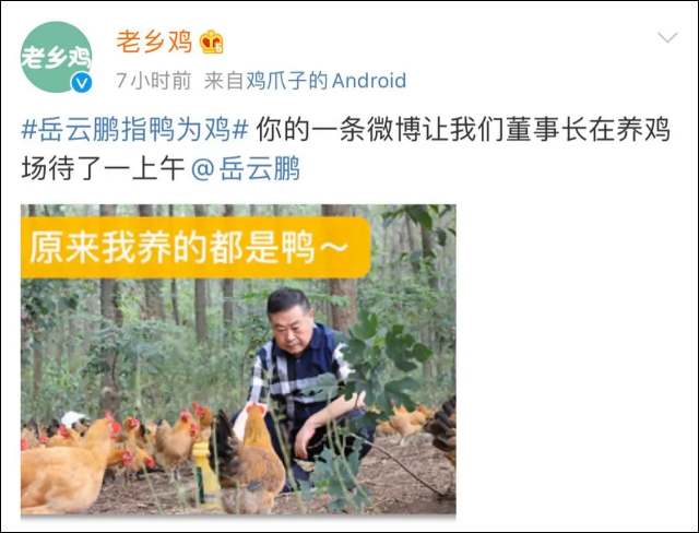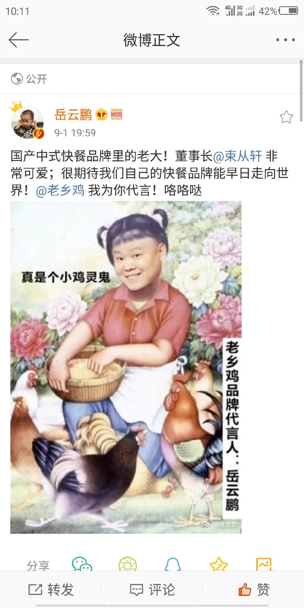 其实就在前一日晚,小岳岳就在微博回复了老乡鸡董事长的隔空邀请:要代言老乡鸡,首先要问问网友的意思。